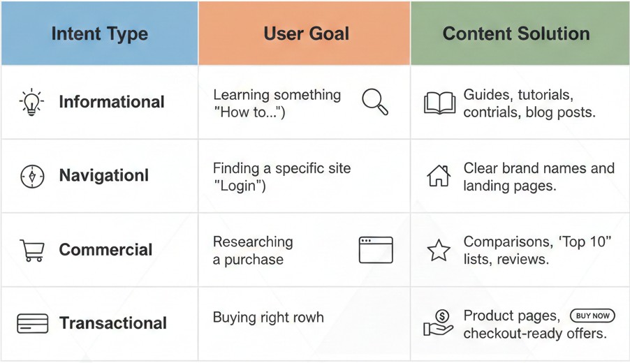 Even high-quality content will fail to rank if it doesn't match Search Intent. A search engine categorizes queries into four main buckets: